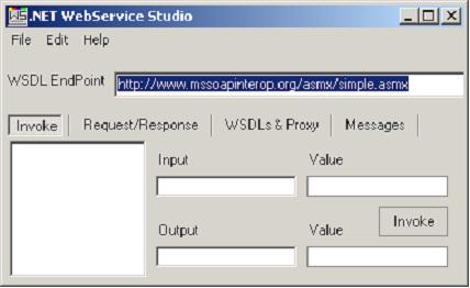 .NET Webservice Studio ist ein Werkzeug, das die Verwendung von Web-Services vereinfacht, ohne dabei Visual Studio .NET zu verwenden. Der Benutzer kann eine Web-Service-Beschreibung in Form eines WSDL-Anbieters angeben. Webservice Studio erzeugt dann durch Drücken des GET-Buttons ein .NET-Proxy-Objekt. Alle angebotenen Methoden des WebService werden in einer Auswahl angezeigt, aus der der Benutzer eine Methode auswählen und ihre Eingabeparameter eingeben kann. Durch Drücken des Invoke-Buttons wird die SOAP-Anfrage zum Web-Service-Anbieter geschickt und dessen Antwort dargestellt.